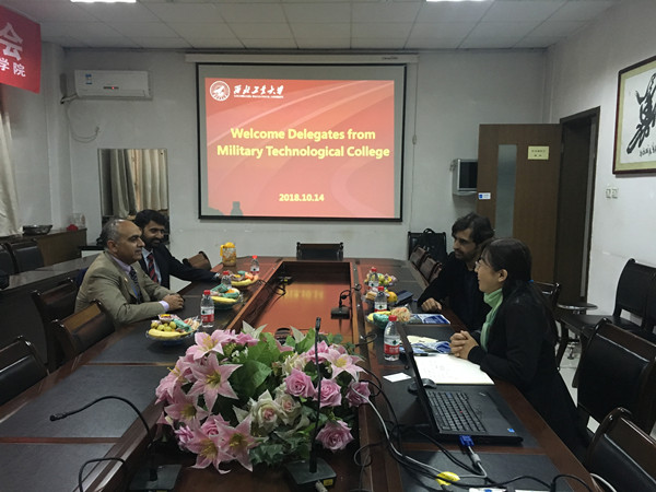 受永利集团3044官网欢迎您邀请,阿曼军事技术学院(Military Technical College,MTC)代表团赴永利官网参加80周年校庆活动。10月14日,MTC教授Abid Ali Khan一行来永利集团3044官网欢迎您访问交流。学院副院长骞爱荣教授亲切会见了来宾,学院留学生Raees Fida Swati和外事秘书郭昕参加会见。